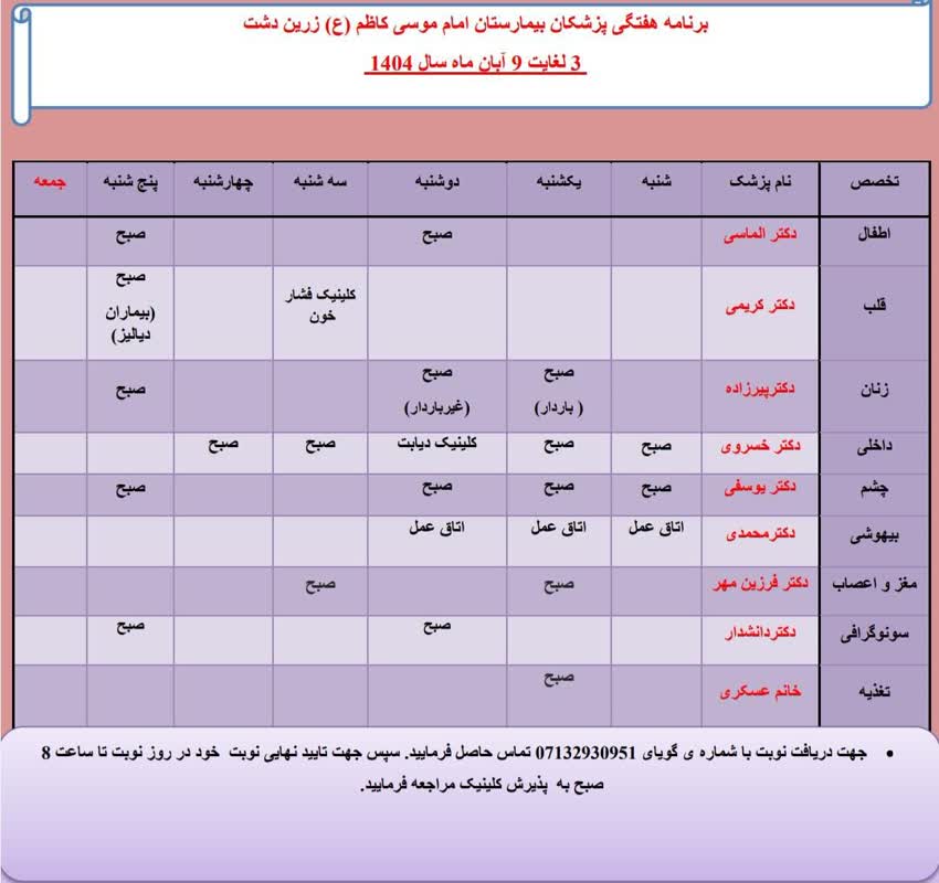برنامه هفتگی پزشکان متخصص کلینیک تخصصی بیمارستان امام موسی کاظم (ع) شهرستان زرین دشت 3 تا 9 آبان ماه1404