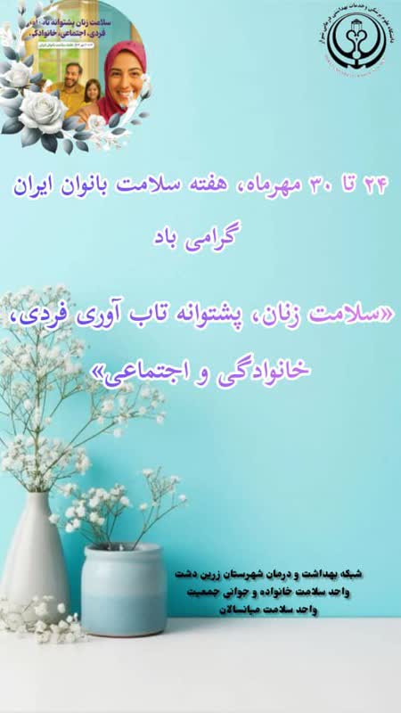 بیمارستان حضرت امام موسی کاظم (ع) شهرستان زرین دشت هفته ملی سلامت بانوان 24 تا 30 مهر ماه ، هفته سلامت بانوان ایران گرامی باد گروه خبری : اطلاعیه ها کد خبری : 135184 کپی کلیدواژه