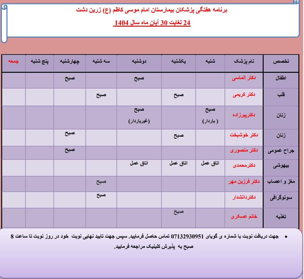 برنامه حضور متخصصان در کلینیک تخصصی بیمارستان امام موسی کاظم (ع) شهرستان زرین‌دشت 24الی 30 ابان 1404
