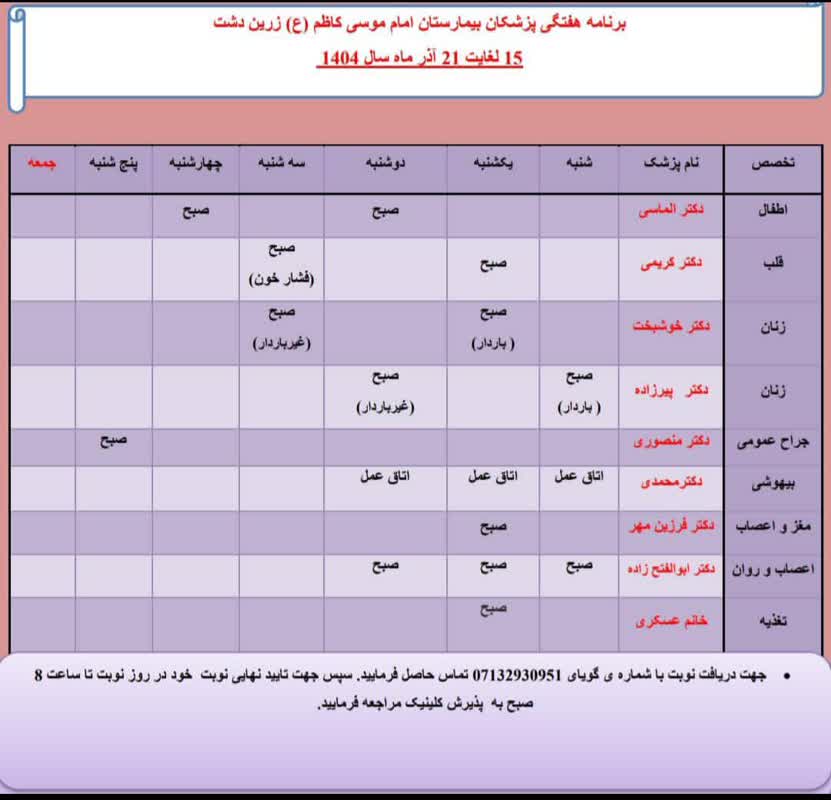 برنامه هفتگی پزشکان متخصص کلینیک تخصصی بیمارستان امام موسی کاظم (ع) شهرستان زرین دشت15تا 21آذر ماه1404