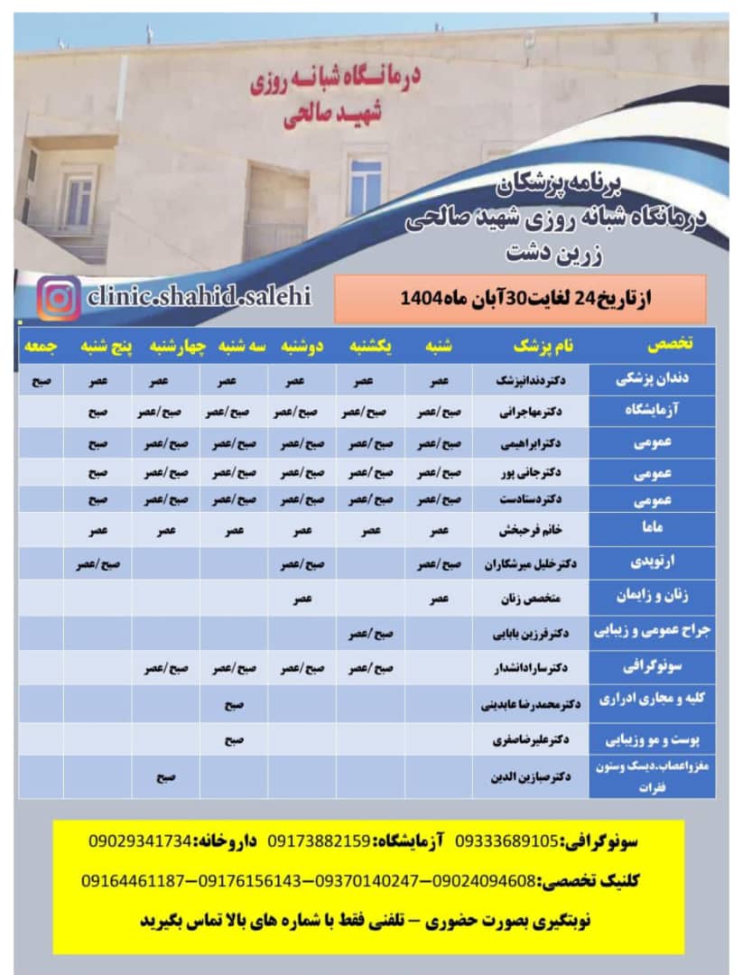 برنامه هفتگی و روزانه کلنیک تخصصی شهیدصالحی(ازتاریخ۲۴ لغایت۳۰ آبان ماه ۱۴۰۴)