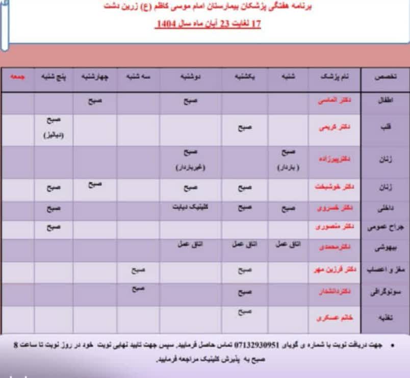 برنامه کلینیک بیمارستان زریندشت از ۱۷ لغایت ۲۳ آبان ۱۴۰۴