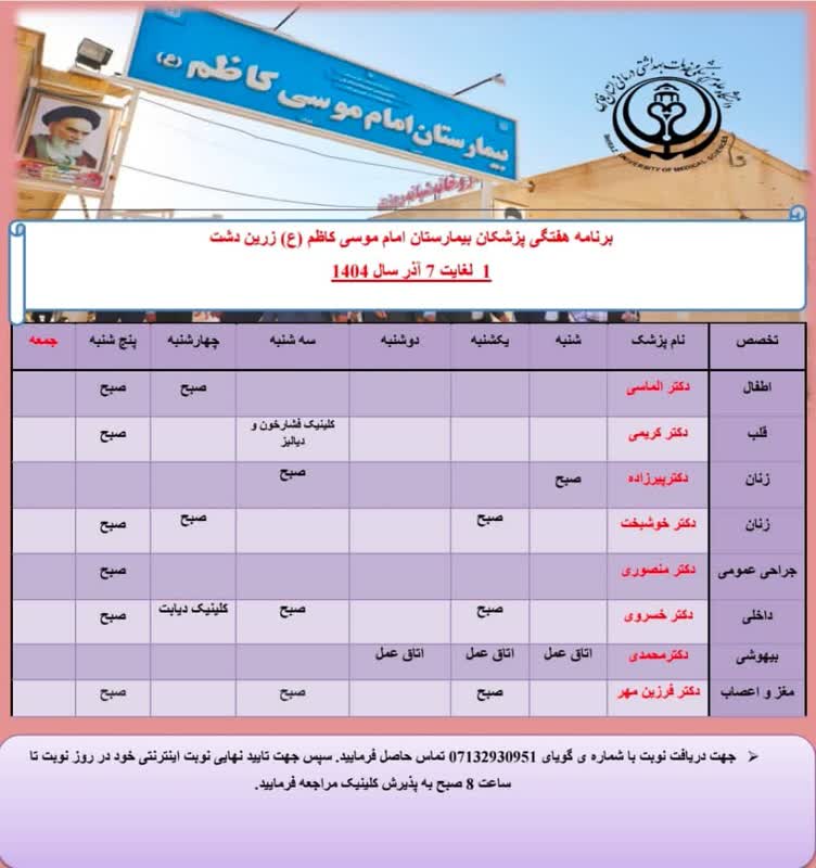 برنامه هفتگی پزشکان متخصص کلینیک تخصصی بیمارستان امام موسی کاظم (ع) شهرستان زرین دشت 1 تا 79 آذرماه1404